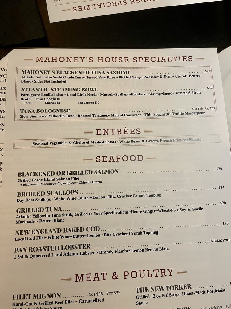 Introducing Mahoney's Atlantic Bar & Grill, a New American - Seafood restaurant with a range of offerings. Located at 28 Main St Orleans, MA 02653, this classy spot is perfect for any occasion. With a diverse menu including vegan and vegetarian options, Mahoney's caters to all dietary needs. Customers rave about the exceptional drinks and meals, describing the atmosphere as top-notch. The swordfish and salmon entrees are highly recommended, as well as the blueberry white chocolate bread pudding. The attentive wait staff, accommodating service, and delicious dishes make dining here a delightful experience. From the best-grilled shrimps to perfectly cooked lobster and scallops, every meal is a culinary delight. Mahoney's is a must-visit spot in Cape Cod for an unforgettable dining experience.